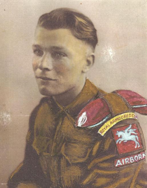 This photograph was taken in early 1943 whilst Bill was a member of the 79th Armoured Development Unit. Never having had a photograph taken of him whilst in the Airborne Forces, he had the photograph enlarged and painted the insignia of the 6th Airborne Armoured Reconnaissance Regiment about his person, as seen above. Copyright: Bill Gladden.