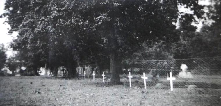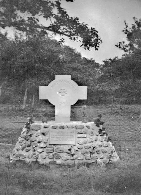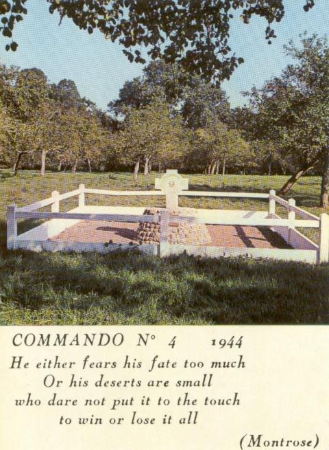A series of original photographs of the monument and field graves from 1944-45, the colour photograph with caption shows the monument without the field graves as the bodies of the fallen Commandos have been removed and relocated in Ranville. The monument remained for some years in the area of the vegetable garden/ orchard. I have taken a few modern day photos of the original position for comparison purposes, it proved impossible to take photographs from the same position as the 1940s photographers as the land forms part of the manor which is a private dwelling. The chicken wire fence remains the boundary marker and the point of reference for all photos.