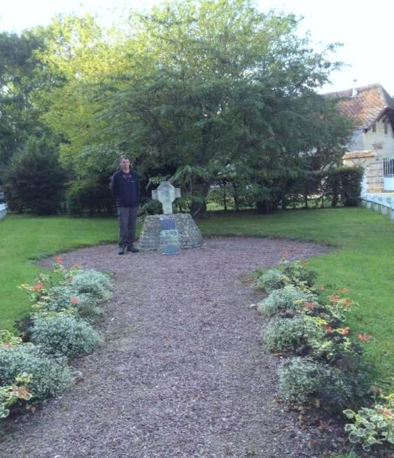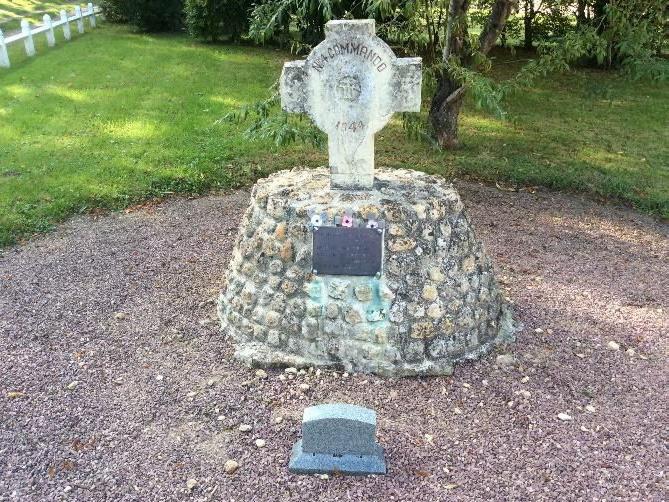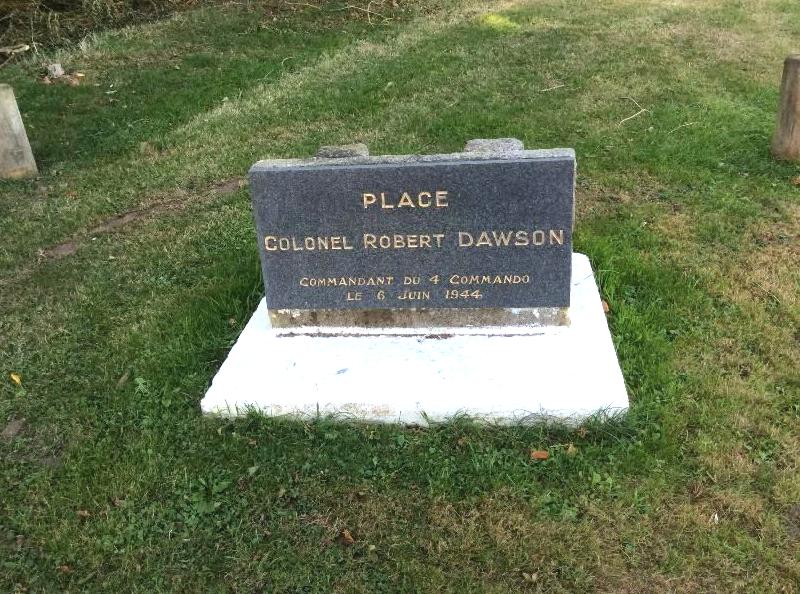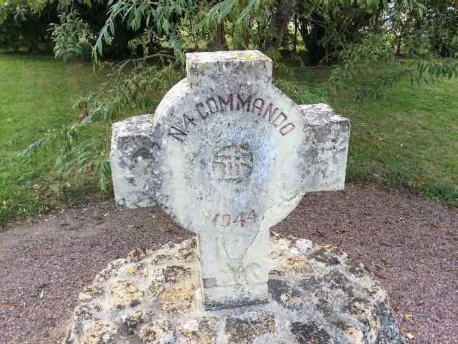 The modern day photographs show the monuments location now (2016) outside the manor house in a small triangular patch of ground named in honour of Lt Colonel Robert Dawson, the motivation for the move was so as to ease and allow access to veteran’s and relatives when visiting and to provide a visible reminder to all of the sacrifice of 4 Commando in this small corner of Normandy.