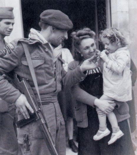 Frenchmen of No.10 Commando meet the people of Amfreville. From left to right: Commandos Laot and Priez (wounded 12th June), Mme Andrée Michèle and Danièle Michèle. Copyright: Imperial War Museum.