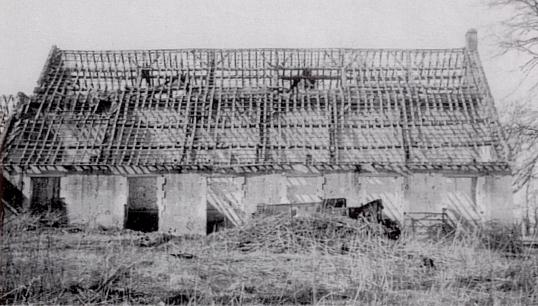 The remains of a barn in the Bois de Mont, destroyed by fire. Partially obscured, centre right, is a knocked-out Universal Carrier. Copyright: Fred Scott.