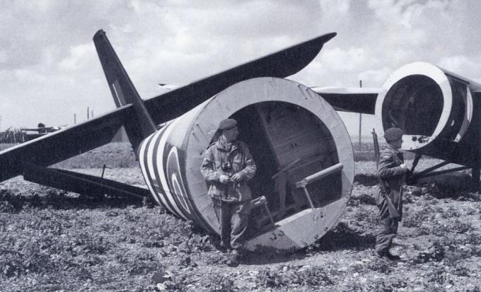 An airborne soldier and an officer (centre) standing beside the discarded tail section of a Horsa glider. Copyright: Imperial War Museum.