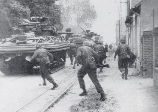 No.4 Commando fight through Ouistreham alongside a Sherman DD Tank. Copyright: Imperial War Museum.