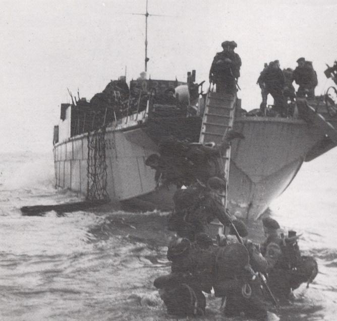 Royal Marine Commandos make their way ashore. The men at the bottom of the photograph are trying to hold the gangplank steady, however an unfortunate marine (centre), weighed down by a bicycle, has slipped and fallen.