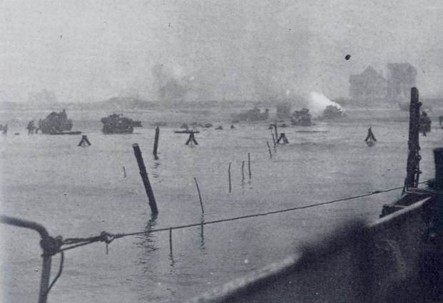 British tanks and infantry coming ashore, under fire, at 08:30 on Sword Beach. Copyright: Imperial War Museum.