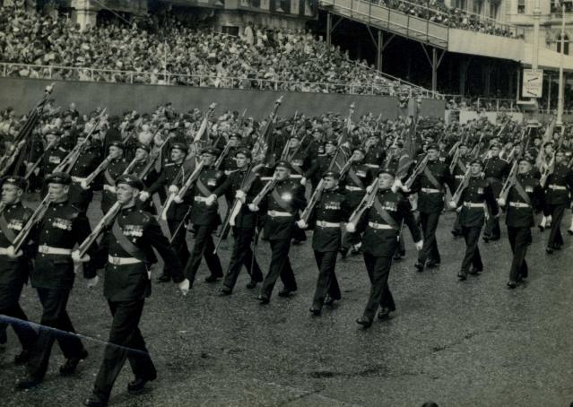 CSM Dent (closest to the camera, bottom left) with the 2 Para Colours Party at the Coronation of Queen Elizabeth II, 2nd June 1953. Larger image.