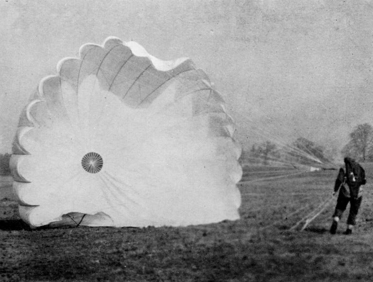 A parachutist collapsing his canopy on the ground.