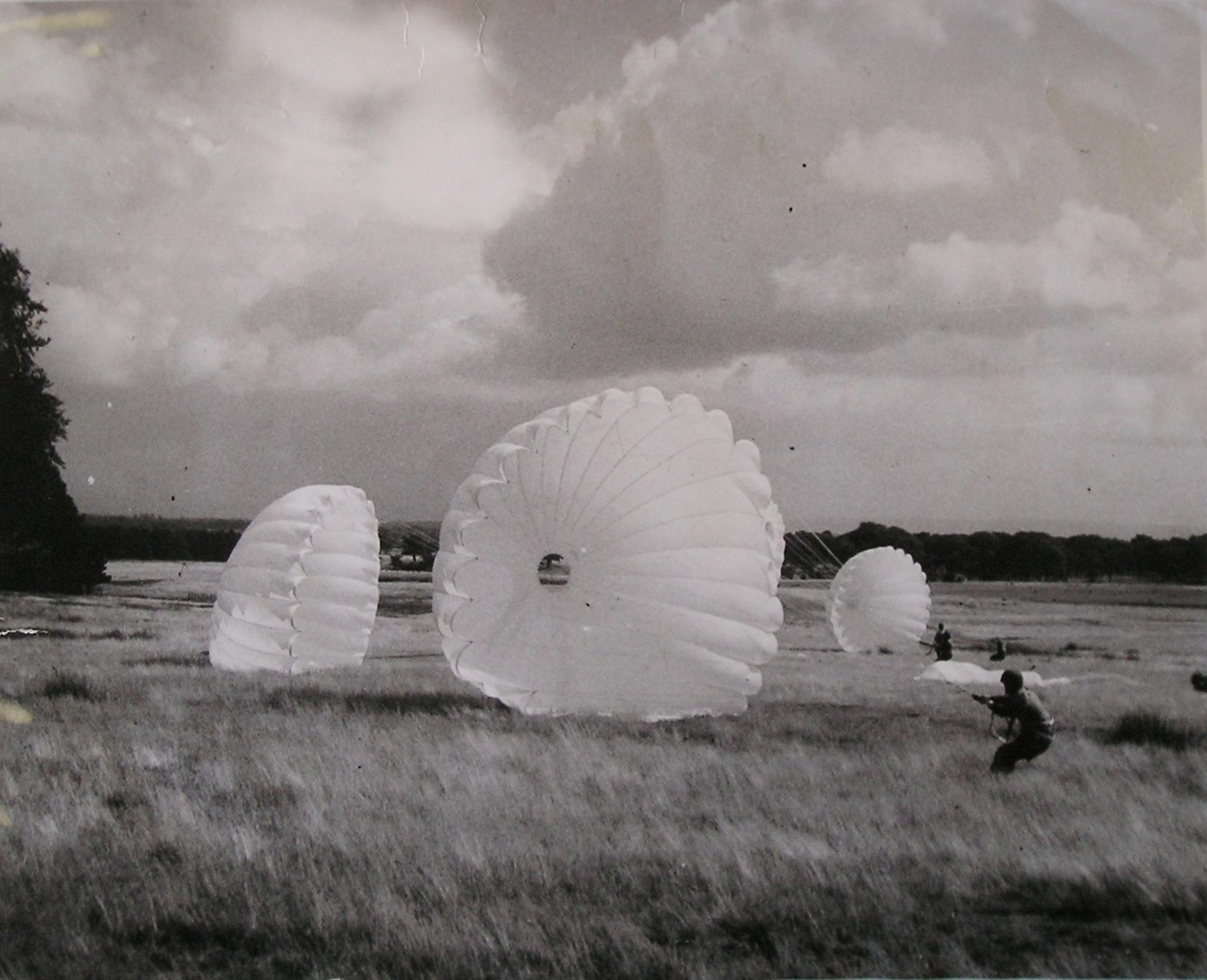 Paratroopers collapsing their canopies after landing, early 1942. Larger image. Copyright: IWM H22798.