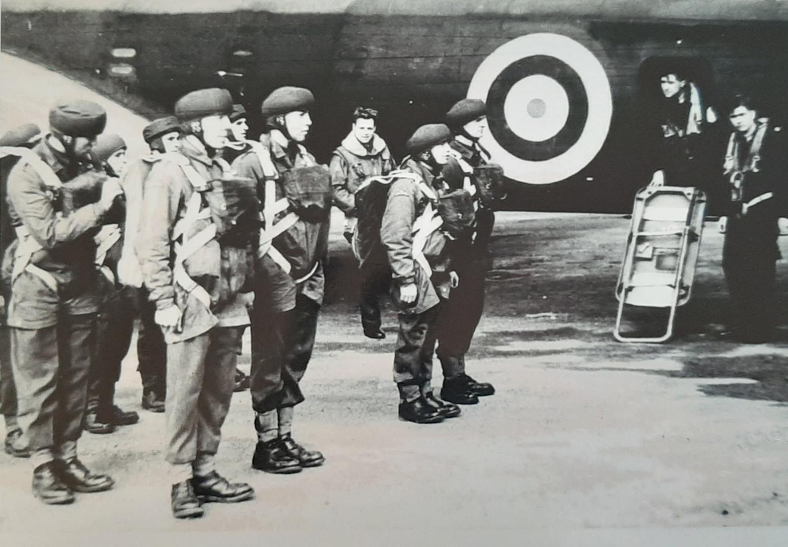 Parachutists ready to emplane at Ringway. James Thomas Nash is standing closest to the camera on the front row, and immediately behind him, checking his equipment, is Reg Curtis. Larger image. Copyright: Airborne Forces Museum.