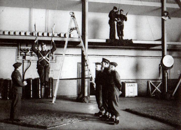 Trainees practicing landing technique at Ringway. Copyright: IWM CH2595.