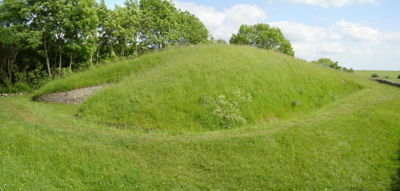 A panorama from the north-western aspect. The stonework to the left marks the approach to the false northern entrance, with the north-west chamber just out of shot to the right of the mound. 1604x768.