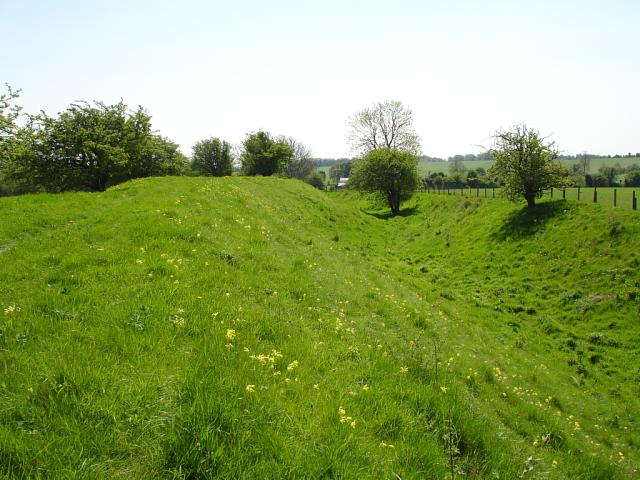 Facing south-east along the south-western rampart. The Ridgeway runs in between the thick line of trees in the middle distance to the right. 1024x768.