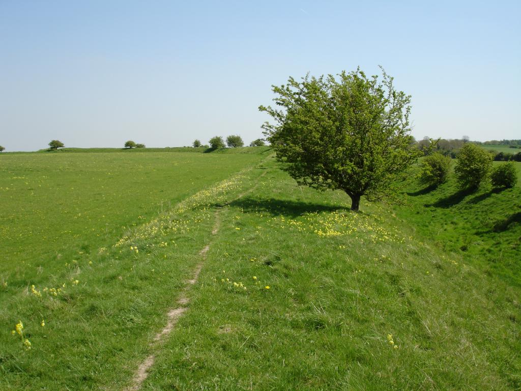 Standing on top of the southern rampart, looking east, with the ditch to the right and the fort interior to the left. Note the curve of the rampart in the distance, running from the left to the centre. 1024x768.