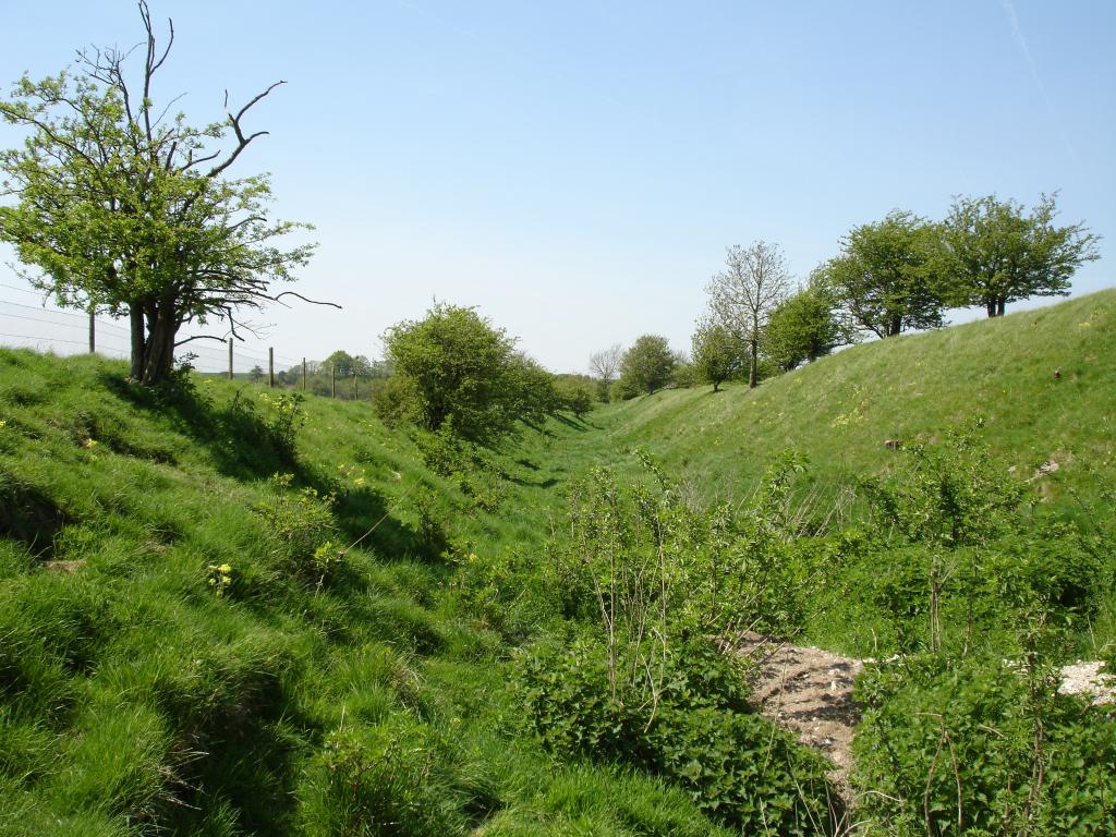 Looking west along the southern ditch; the fort interior is over the bank to the right.