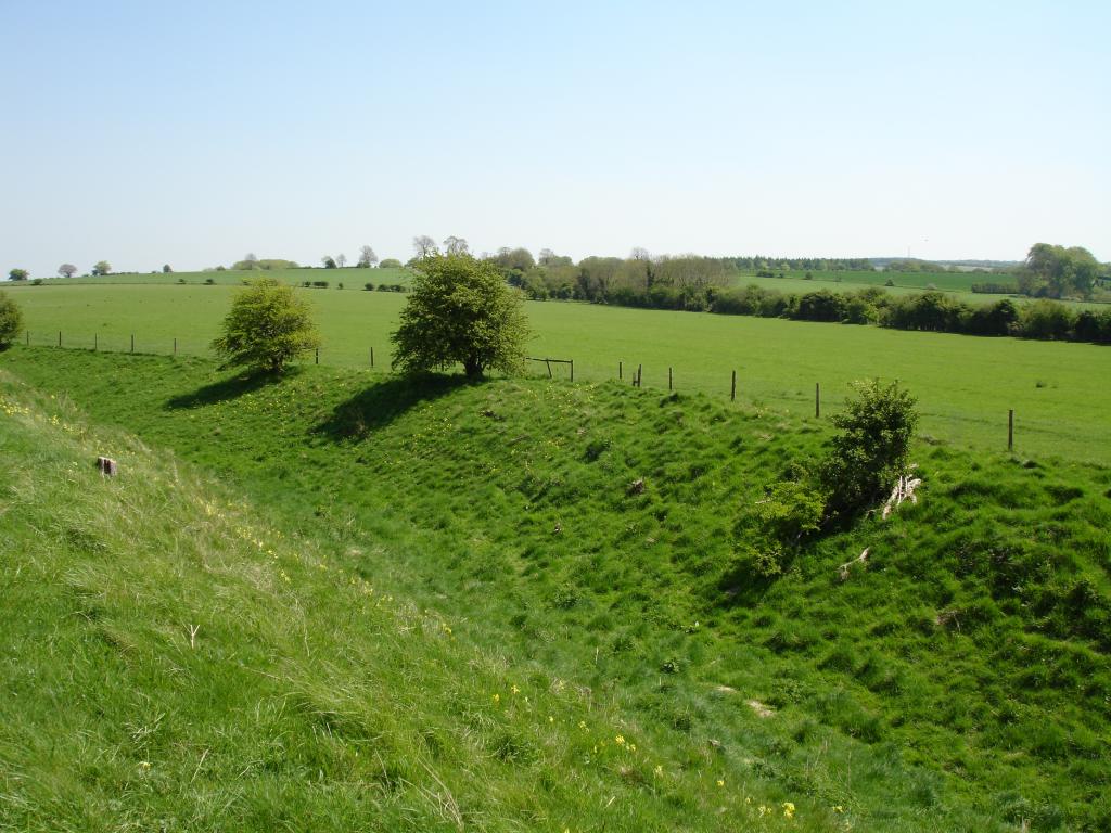 Standing on the southern-rampart, looking south-east at the terrain beyond. The Ridgeway runs in between the thick line of trees in the middle distance. 1024x768.
