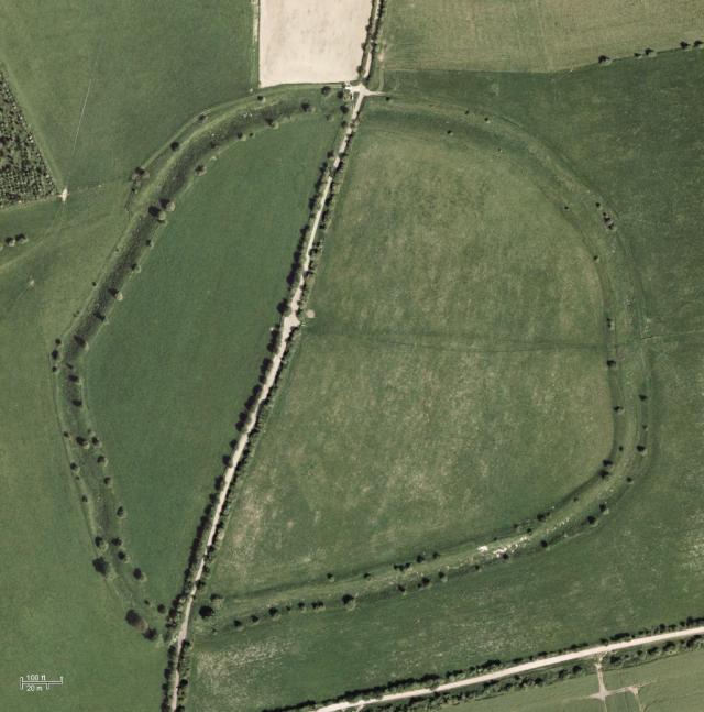 An aerial view of Segsbury Camp with the top face of the photograph indicating north. A modern road bisects the fort, note also at the bottom, the path running left to right is the Ridgeway. Copyright: Google Maps. 1024x768.