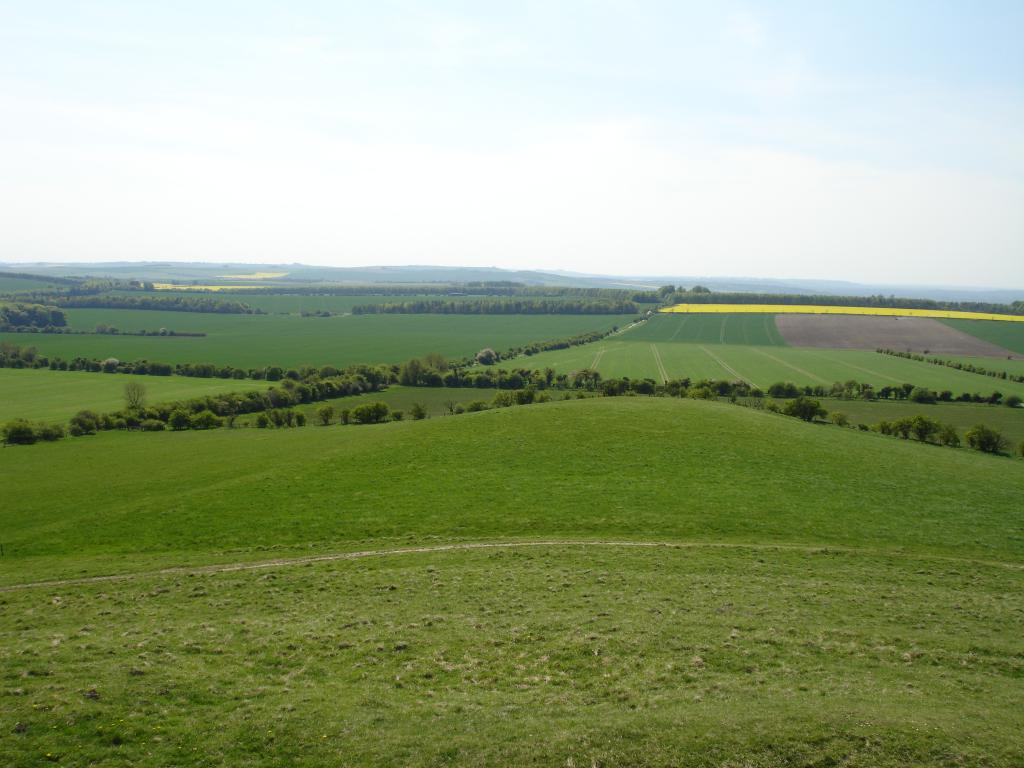 The southern-western aspect. The Ridgeway is hidden by the line of trees running from the lower left and then in a straight line to the left edge of the yellow field in the distance. Just beyond the far side of this field is Wayland's Smithy. Click here for a view of Uffington Castle from the bottom left tip of the yellow field. 1024x768.