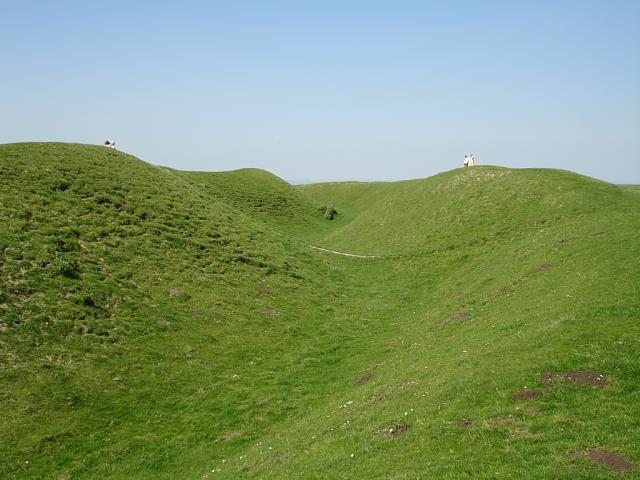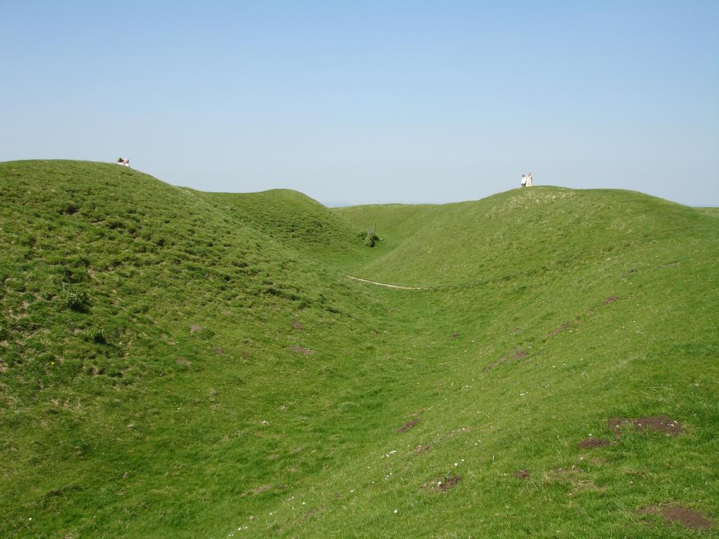 Taken outside the centre of the eastern rampart, with the fort interior to the left. The path, in the centre, marks the original eastern entrance that was blocked off. The summit stone can be seen to the right where the two figures are standing. 1024x768.