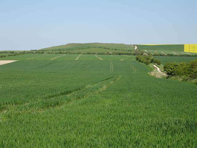 Looking north-east to Uffington Castle (centre horizon) from near Wayland's Smithy. The Ridgeway is the white path to the right. Click here for a view of this spot from Uffington Castle. 1024x768.