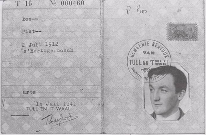 Dauncey's false Identity Card which the Dutch Resistance supplied him with. The Card proclaims him to be Piet Bos, a conveniently deaf and dumb doctor.