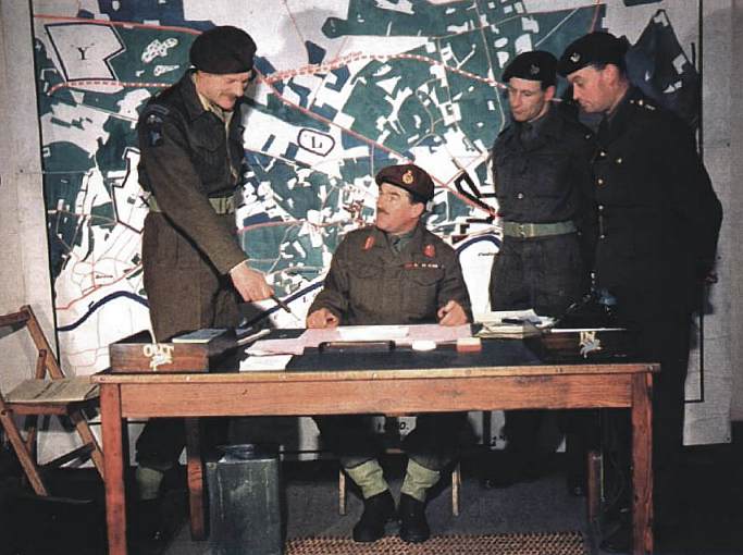 Urquhart (seated) in a posed photograph with a map of the Arnhem area behind him. It would have been taken after the battle as the man on the left is Lieutenant-Colonel Eric Henry Steele-Baume, the GSO-1 (Air), who was attached to IX Troop Carrier Command during Market Garden.