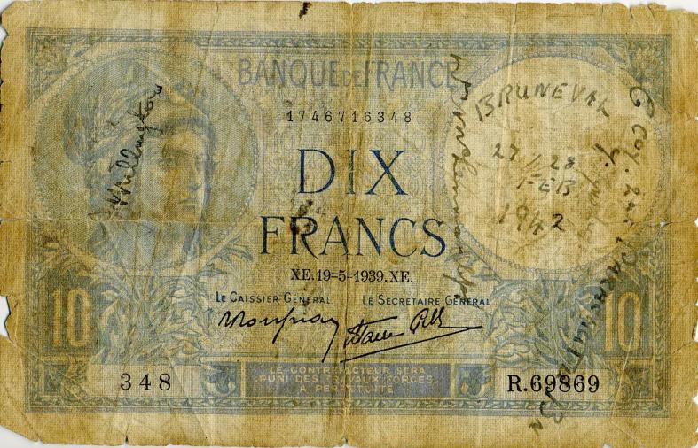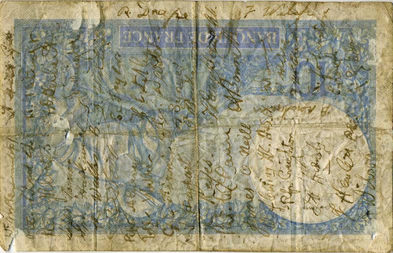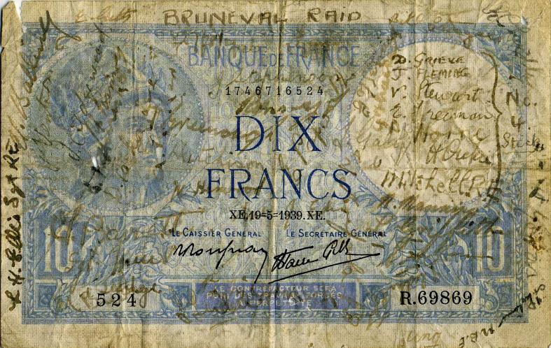 Two French bank notes, signed by approximately 60 men who participated in the Bruneval Raid. Frank McCausland's signature can be seen, written vertically in bold ink, right of centre on the final picture. Thanks to Bob Hilton.