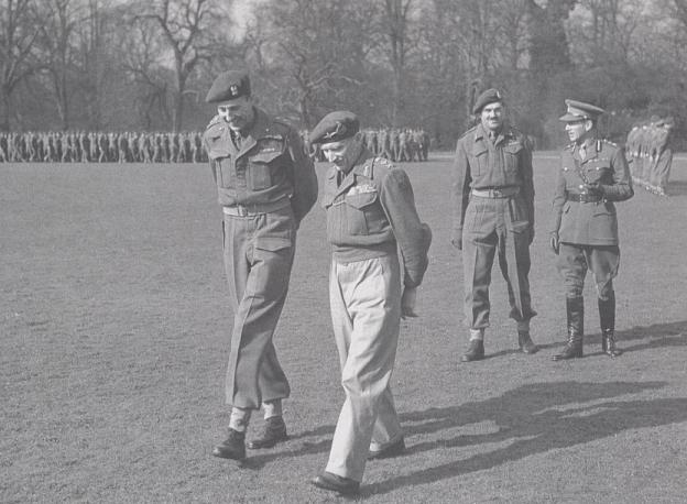 Brigadier Lathbury (far left) speaking with Field Marshal Montgomery during an inspection. Walking on behind them are Major-General Urquhart and Lord Bronlow. Copyright: IWM H36657.