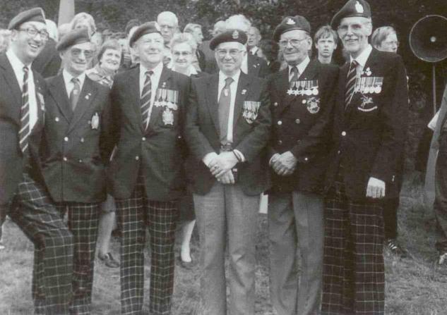 Norman Allwright with fellow 7th KOSB and 1st Airlanding Brigade veterans and at Ginkel Heath, 1985. Left to right: Geoff Roberts, Wilf Bell, Norman Allwright, L.R. Powell (1st Border), Ben Cooper (2nd South Staffords) and O'Neil F. Berry.