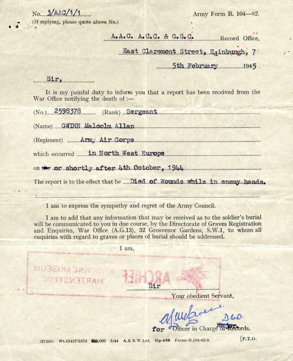 Official notification of Sergeant Gwinn's death. Copyright: Gary Bennett.