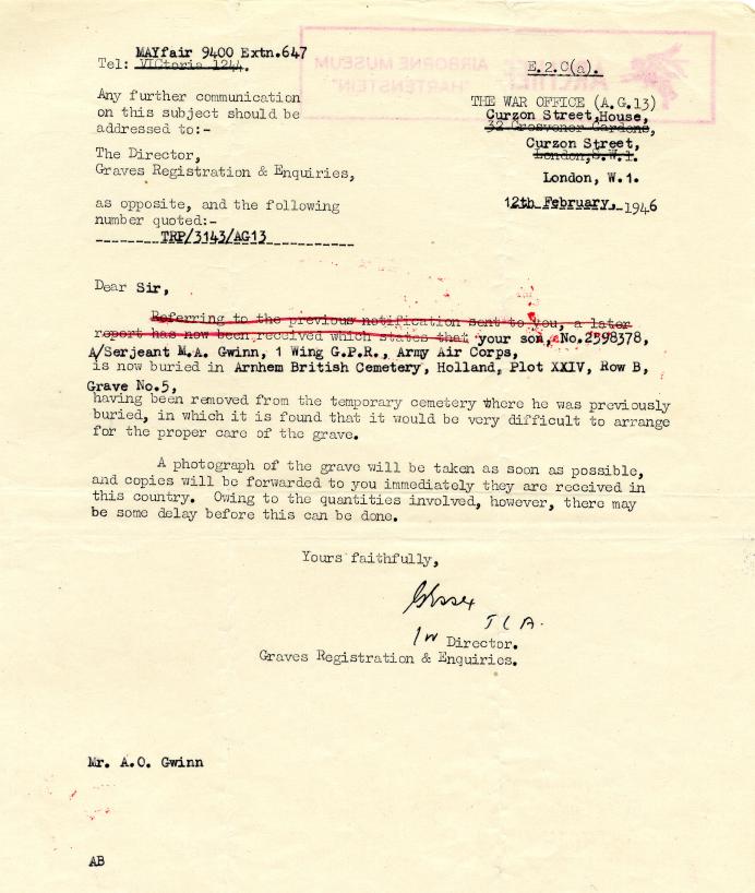A letter detailing Gwinn's burial in the Airborne Cemetery. Copyright: Gary Bennett.