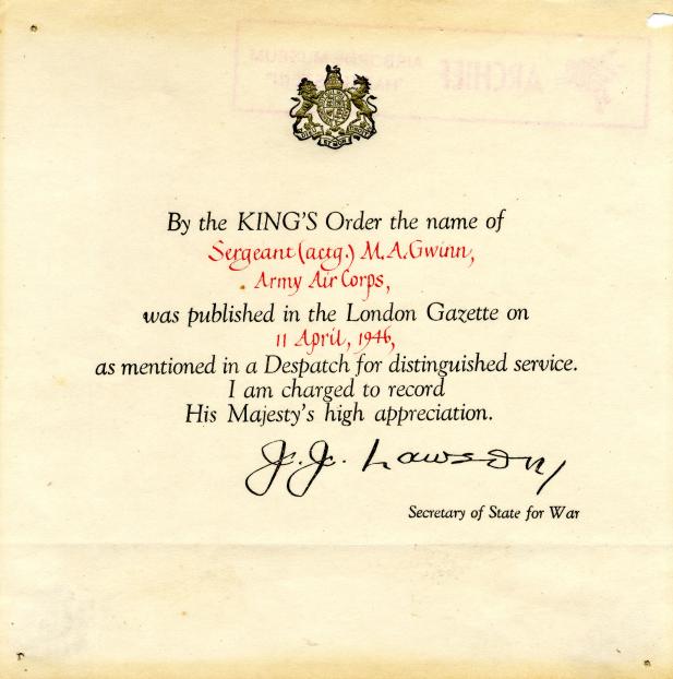 A certification confirming Gwinn as being Mentioned in Despatches. Copyright: Gary Bennett.