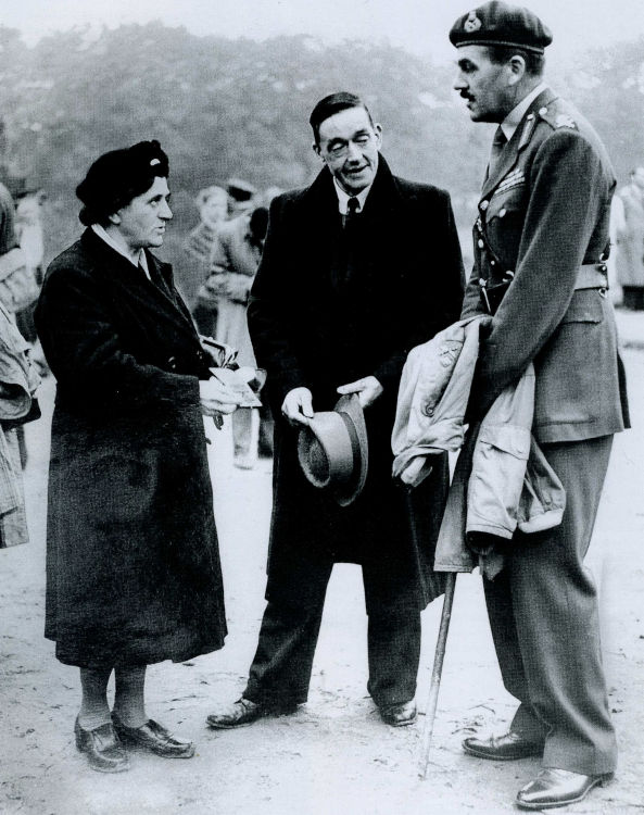 Major-General Urquhart meeting the parents of Lance-Sergeant Baskeyfield VC in Holland, 1946. Mrs Baskeyfield is holding her son's Victoria Cross.