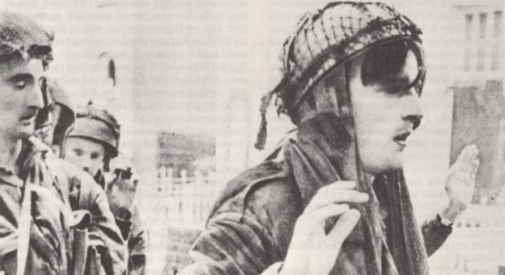 3rd Battalion and Royal Engineer prisoners being marched away from the bridge after their defence of the School. The man on the right is Sapper Booth. Copyright: Bundesarchiv.
