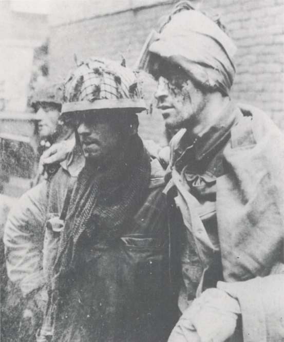 Taken to the east of Arnhem bridge in the afternoon on Wednesday 20th September. Left to right: Sapper J. Dinnie (in the background), Sapper C. Grier, and Lance-Corporal R. Robb (wounded, and seemingly wearing a German greatcoat. All of these men were of the 1st Parachute Squadron, RE, and had been captured following the surrender of the School. Grier and Robb are also featured on this photograph. Copyright: IWM HU2131.