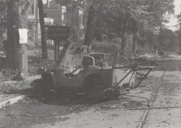 A wrecked medical Jeep, denoted by the frame at the rear used for laying a stretcher across, near the Main Dressing Station on the Utrechtseweg-Stationsweg. Copyright: Bundesarchiv.