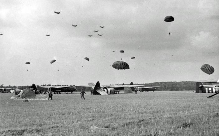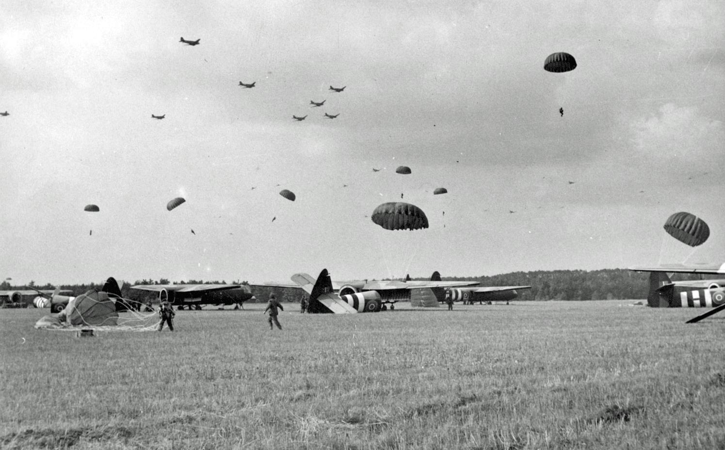 Parachutists coming down amongst Horsas on the edge of DZ-X. Note the detached tail section on the central glider, removed after landing to enable the equipment inside to be unloaded. Larger image. Copyright: IWM BU1163.