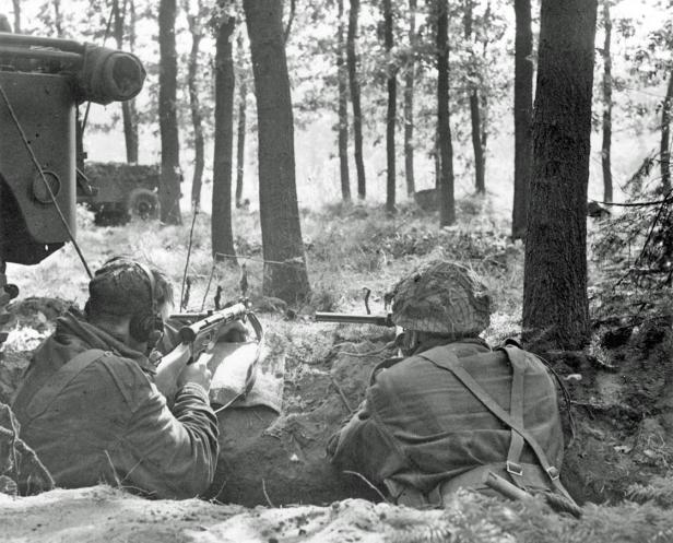 Two Airborne soldiers in the Oosterbeek pocket with Sten guns. The man on the left is a signaller as he wears a set of headphones connected to the Jeep above him, containing a longer-ranged Type 22 set. Larger image. Copyright: IWM BU1143.