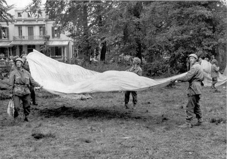 Airborne soldiers in the grounds of the Hartenstein Hotel, probably on Saturday 23rd, try in vain to signal resupply aircraft using parachute silk. The densely wooded terrain surrounding Oosterbeek, not to mention the raging fires and smoke, made it almost impossible for pilots to navigate via landmarks. Even if they saw the efforts of these troops they would ignore them as German troops were similarly keen to attract their attention. Copyright: IWM BU1119.
