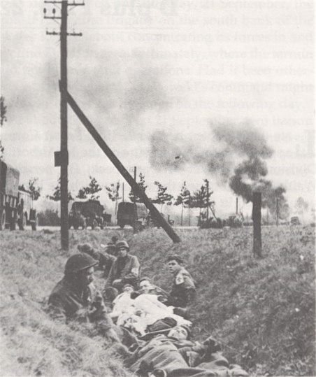 British wounded and medical personnel take cover in a roadside ditch as German artillery fire impedes XXX Corps again, near Veghel on Friday 22nd September. Copyright: United States Army.