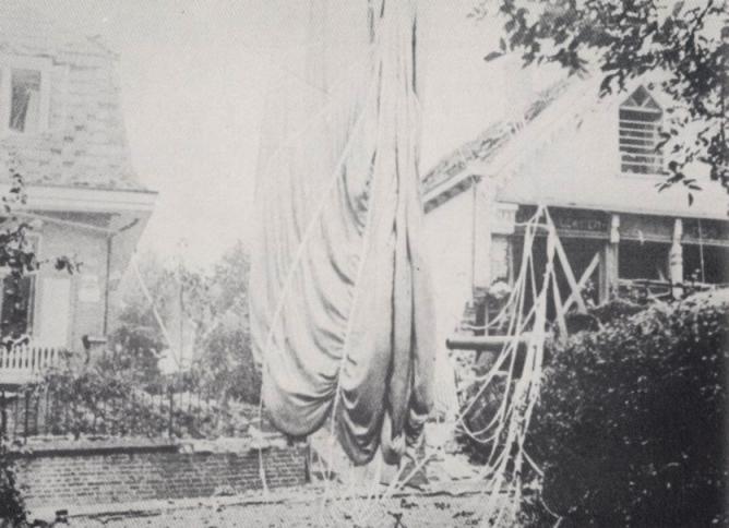 A German armoured vehicle edges forward into Oosterbeek. In the foreground, evidence of the resupply flights hangs from a tree.