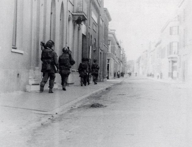 An eight-man patrol of mixed units, led by Captain Killick of the 89th Field Security Section, moves westwards from the bridge along the Weerdjesstraat in an attempt to locate the 1st Para Brigade moving into Arnhem. In the distance, Dutch civilians look on. In the event the patrol made little ground before they realised they were in danger of being cut off and so withdrew to the bridge, having suffered no casualties and collected several stragglers and a prisoner, who was captured at the crossroads which can be seen a few metres in front of the men. They reported that there were no sounds of battle to the west of Arnhem and so it was correctly assumed that the 1st and 3rd Battalions were some distance away. Copyright: Sam Presser / Maria Austria Instituut.