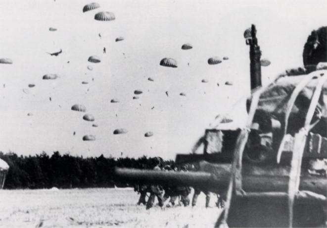 Paratroopers moving off DZ-X as others continue to land, filmed by Sergeant Mike Lewis of the Army Film and Photographic Unit. Copyright: R. P. G. A. Voskuil.