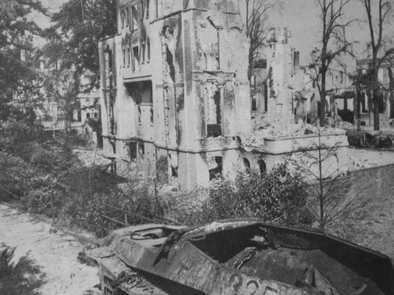 A knocked-out German half-track near the School at Arnhem Bridge.