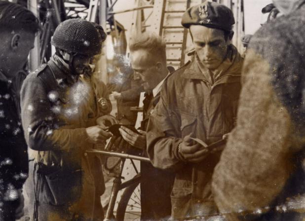 Polish soldiers guarding Grave Bridge, after Operation Market Garden, checking documents. If you know anything about the circumstances of this photograph, please write to pegasusarchive@googlemail.com. Copyright: Anna Jachnik.