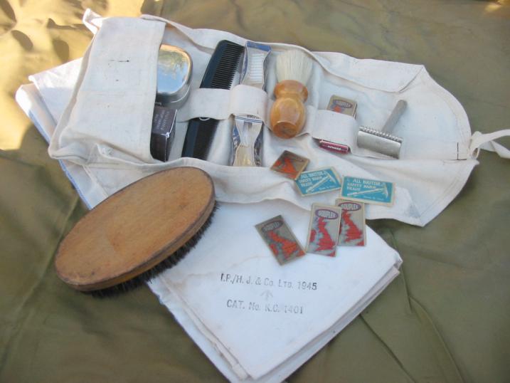 A closer view of the wash roll, containing a metal soap dish, shaving cream stick, comb, toothbrush, shaving brush, razor blades and razor, hair brush and underneath is a 1945 towel. Copyright: Andrew Cummings.