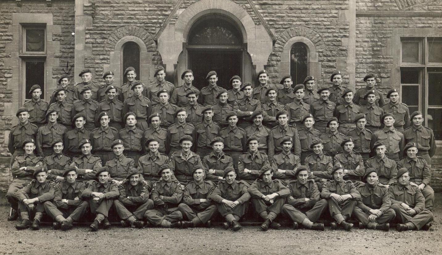Second row: Sergeants E. Corbett, G. Guy, A. Goodman, A. Davies, 2nd Lieutenant L. Robson, Captain J. R. Smith, Major A. J. Deane-Drummond MC, Lieutenant D. A. Polley, CSM F.H. Clift, Sergeants T. Turnbull, A. Armour, H. Spivey, R. Cole.