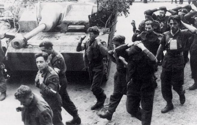 British prisoners being marched away from the Vreewijk Hotel on Wednesday 20th September. The self-propelled gun is a Stug 40-G. Note the man on the extreme right of the photograph with a field medical card hung about his neck, which details the wounds he has sustained. Copyright: Bundesarchiv, Koblenz.