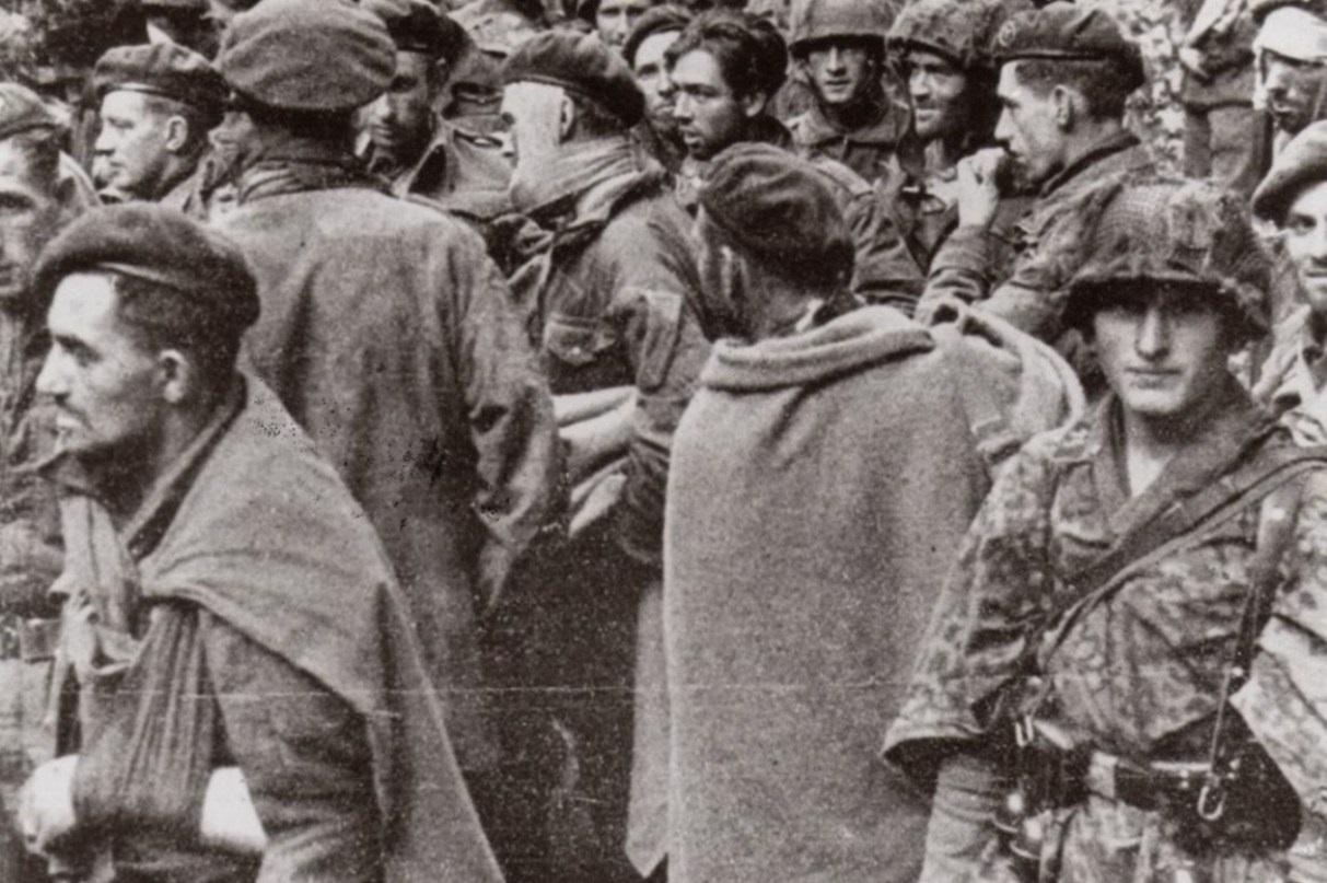 A German guard (bottom right) with British soldiers captured around Arnhem Bridge. Larger image. Copyright: Gelders Archief.