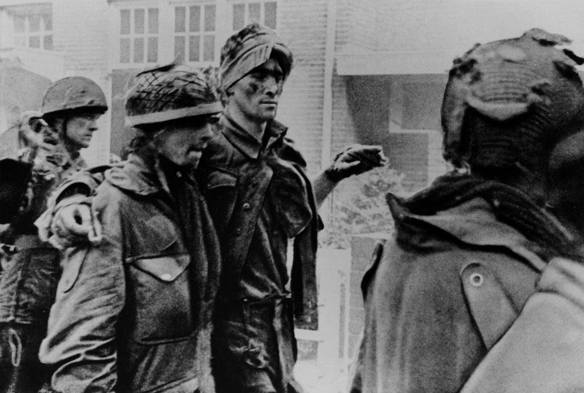 1st Parachute Squadron prisoners being marched away from the Bridge area after resistance ended at the School. Left to right: Lance-Sergeant Norman Swift ("A" Troop), Sapper C. Grier, Lance-Corporal R. Robb, Unknown. Grier and Robb are also featured on this photograph. Larger image.