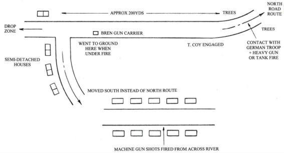 Due to the gunfire we were held up at a right hand junction so Lt. Col. Dobie decided to disengage with the enemy and move south into the built up area. Machine gun shots were fired at us between the houses and from the direction of the River (which was on our right). The Adjutant, Captain. P.M. Groves, the CSM of HQ Coy, W.O.I. H.A. Eatwell and I all crossed a firing point but the firing became too intense and too risky, so it was decided that the rest of the column were to find a different route.